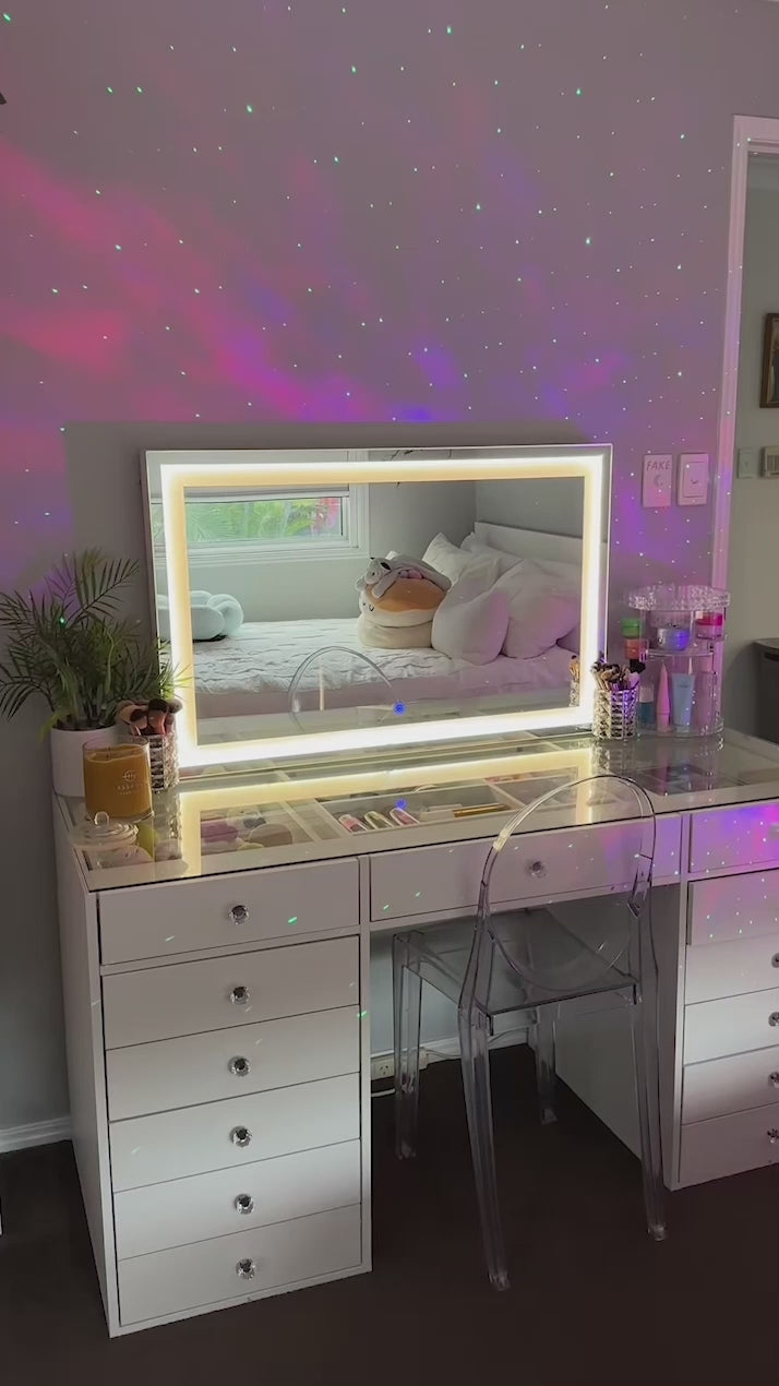 The built-in LED vanity mirror provides the perfect lighting with three adjustable light settings (warm, cool, and natural), ensuring perfect makeup application. With a transparent glass tabletop and diamond-like sparkling handles, this luxury vanity table adds a touch of glam to your beauty station, and is supported by a 3-year warranty that ensures lasting quality and peace of mind for years to come. A must-have for makeup enthusiasts or makeup artists, this unit is the ultimate addition to any modern glam girl’s dream bedroom, adding style and functionality to your beauty routine.