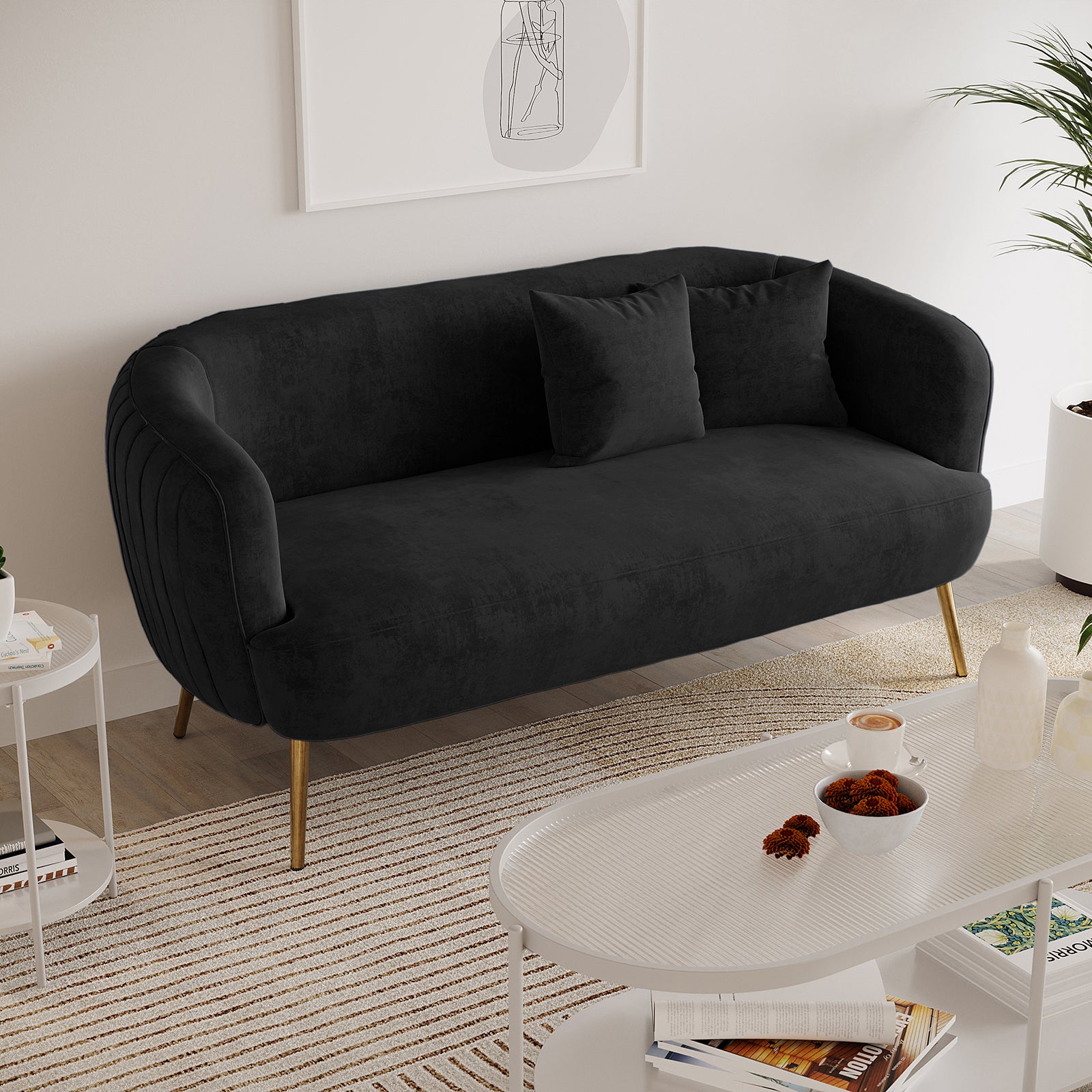 - The Evelyn 2-seater sofa features a curved silhouette upholstered in soft black velvet.