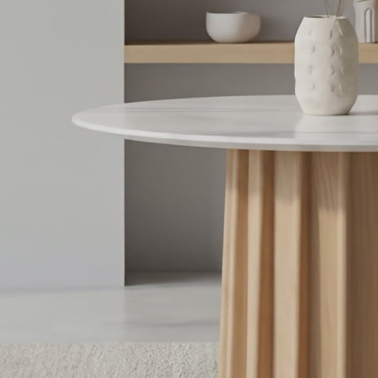Round, welcoming, and just the right size, Gabi comfortably seats four for weeknight dinners or Saturday brunch. The fluted wooden base adds texture and warmth, while the durable sintered stone top gives you that timeless marble look with fuss-free maintenance.