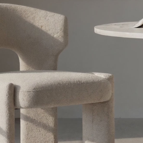 The Lunari’s sculptural silhouette and tactile bouclé upholstery make it a true statement piece, effortlessly complementing a range of refined dining tables. It pairs beautifully with round timber tables to create an organic warmth and inviting ambience, while marble or travertine tables elevate its luxurious texture with a sophisticated, modern edge. For a more contemporary, gallery-inspired aesthetic, the Lunari harmonises seamlessly with sleek glass or black metal tables, adding both visual intrigue and timeless elegance to your dining space. -