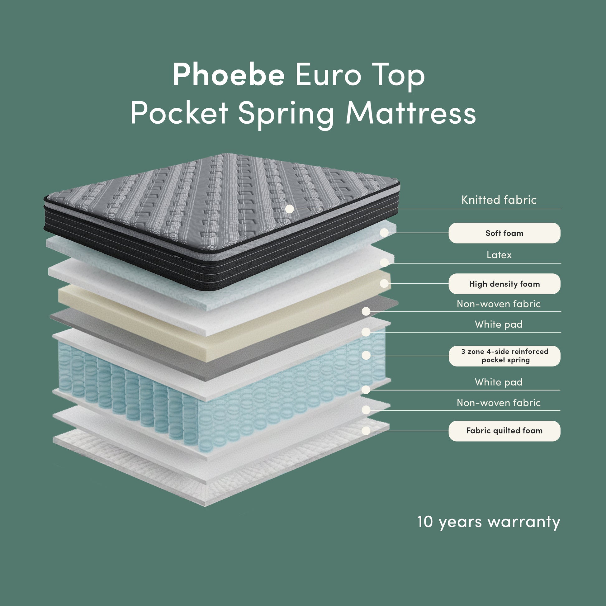 Experience elevated comfort and superior sleep quality with the Phoebe 33cm Medium Firm Foam Euro Pillow Top Pocket Spring Mattress in King, available for fast delivery Australia-wide.