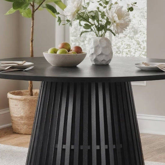 Elevate your everyday dining with the Riri 120cm Round Fluted Wood Dining Table in Black, a beautifully crafted centrepiece that transforms mealtimes into memorable moments. Blending sculptural design with everyday practicality, Riri brings texture, warmth, and elegance to your space—making every meal feel special and every setting look effortlessly curated. If you’ve been searching for a round fluted wood dining table that perfectly balances style and substance, Riri is the clever upgrade your home deserves.