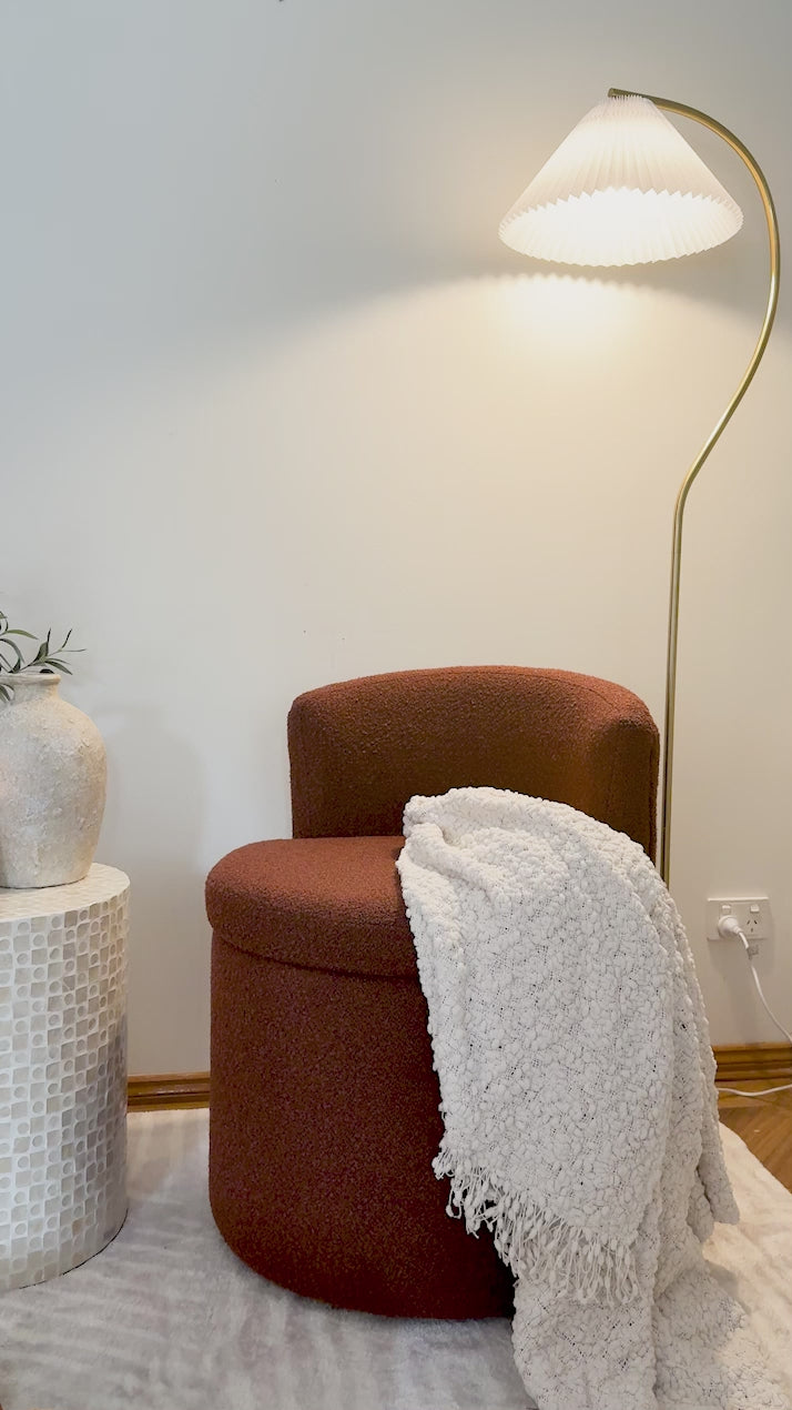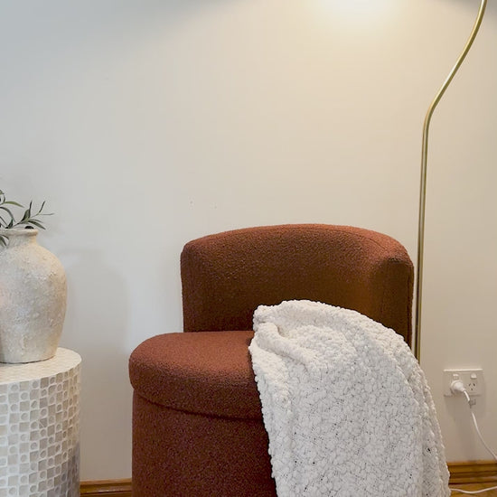 The Sorra Bouclé Swivel Storage Accent Chair in Rust Brown blends tactile comfort with thoughtful function, creating a piece that moves as beautifully as it feels. Upholstered in soft, textural bouclé, Sorra invites touch with its warm weave and sculptural form. A smooth 360° swivel and easy-glide wheels let you flow effortlessly across the room, while the hidden storage beneath the seat keeps everyday essentials neatly tucked away. Designed for both style and practicality, Sorra brings a sense of calm sophistication to bedrooms, studies, or modern living spaces — luxury made effortless.