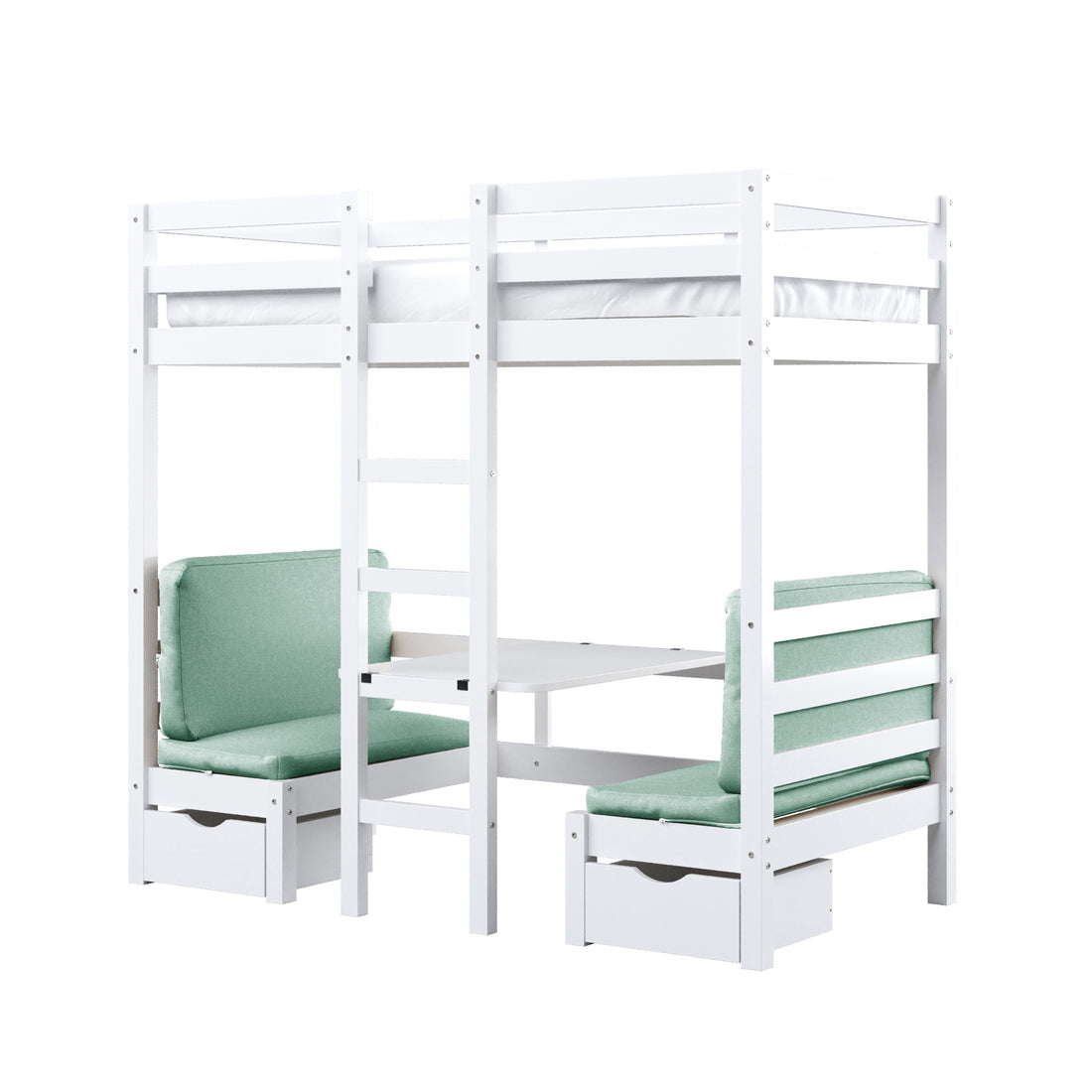 - Brilliant portable design that fulfils many functions - permanent loft bed, two under-bench storage drawers, tabletop and two benches that convert into a spare bed